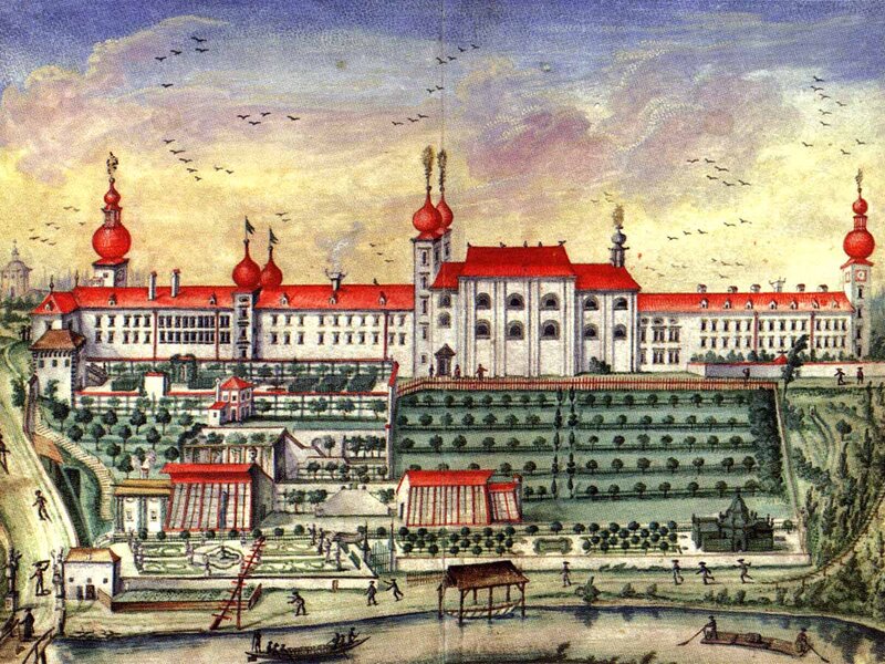 Zu sehen ist das Stift Lambach von Süden. Die Ansicht ist in das Lambacher Rotelbuch eingefügt.