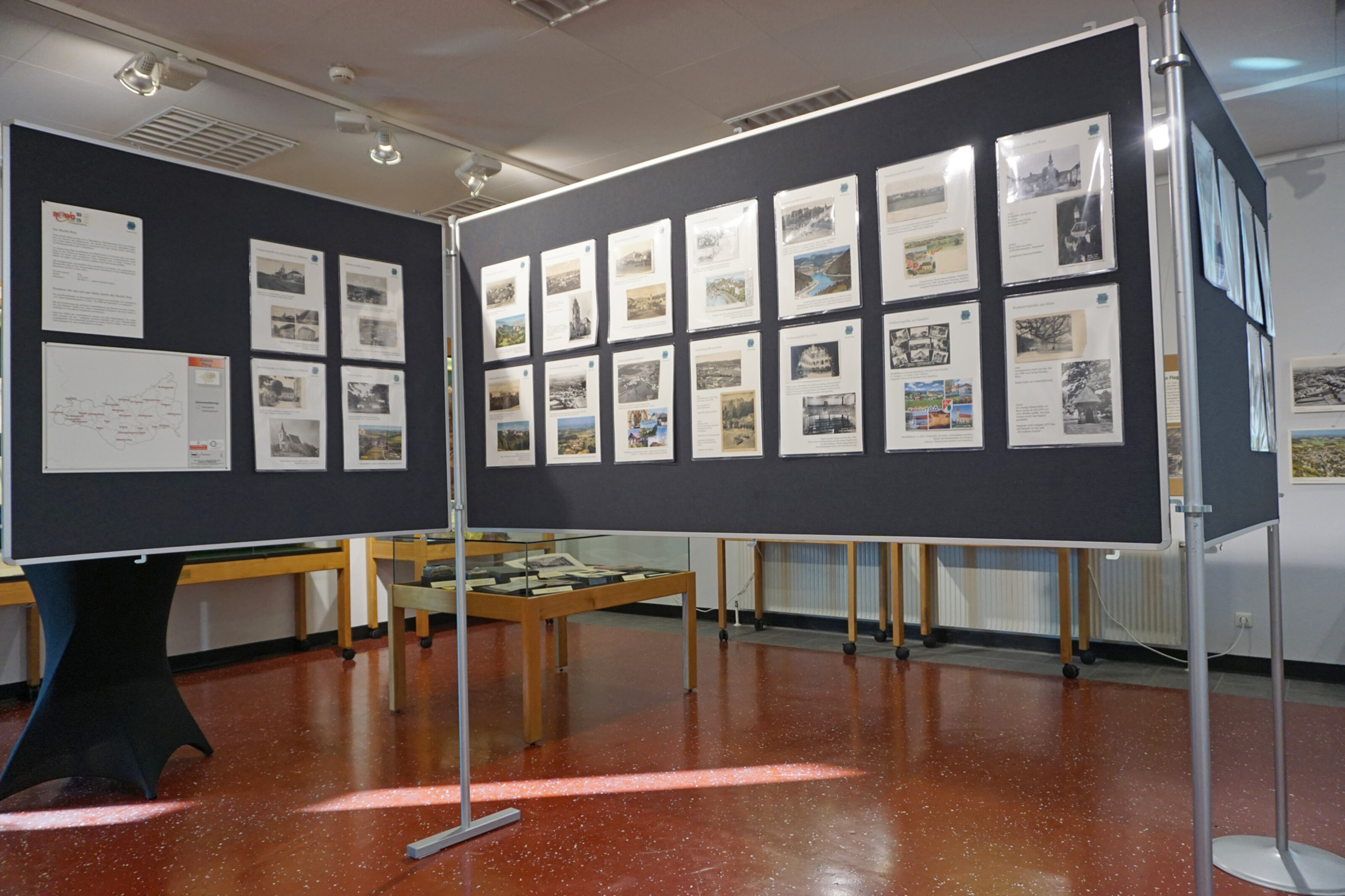 Blick in die Ausstellung. 2021 wurde die Ausstellung "151 Jahre Postkartengrüße aus Perg" um Ansichtskarten aus dem Bezirk Perg erweitert. Foto: Verbund OÖ Museen