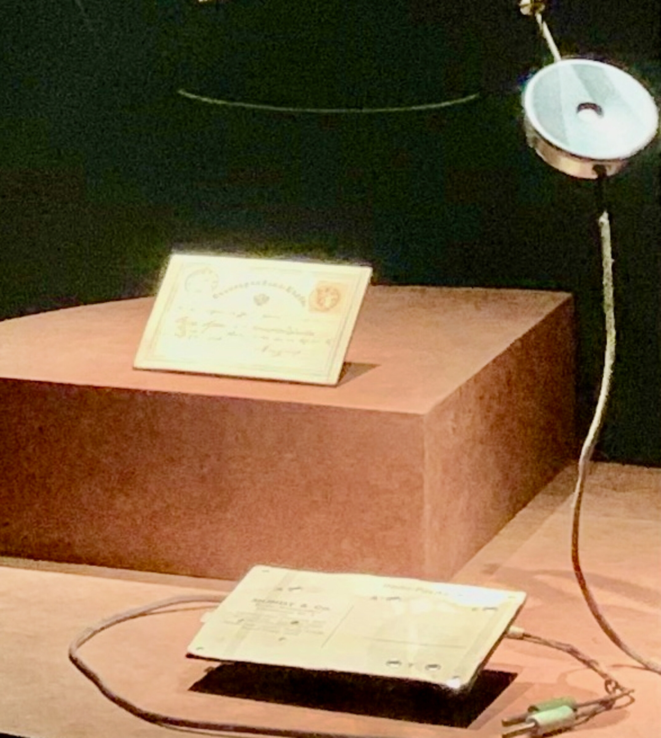 Vitrine Schatzkammer Museum für Kommunikation in Berlin u.a. mit der 1. Postkarte der Welt