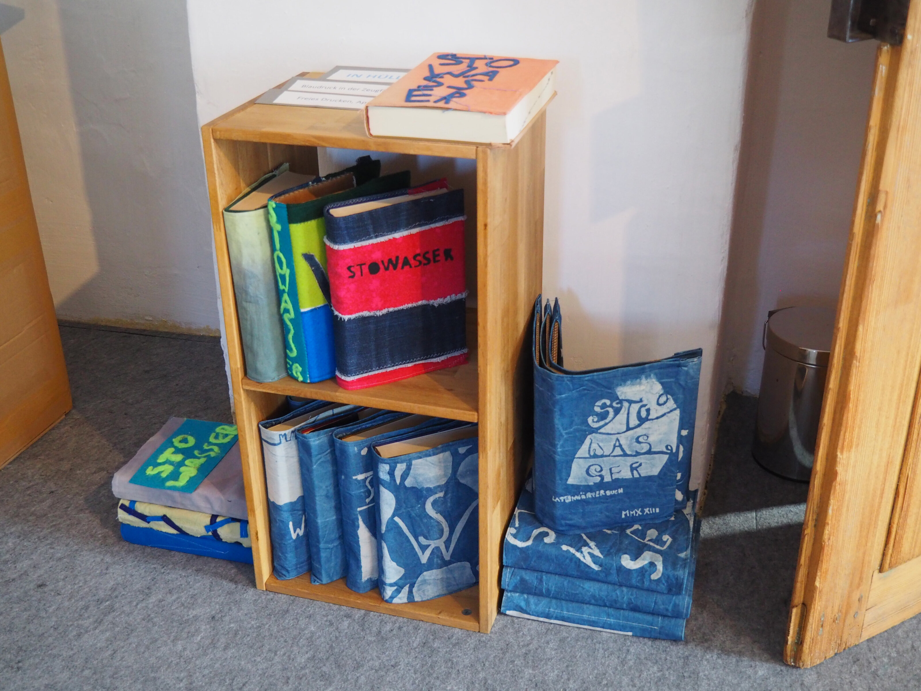 Ausstellungsansicht "130 Jahre Stowassser". Im Rahmen des Schulprojekts "Alles im Fluss" gestalteten Schülerinnen und Schüler der 4A BRG Freistadt kreative Buchcover für die Jubiläumsausgabe. Foto: Wolfgang Harant, 2023