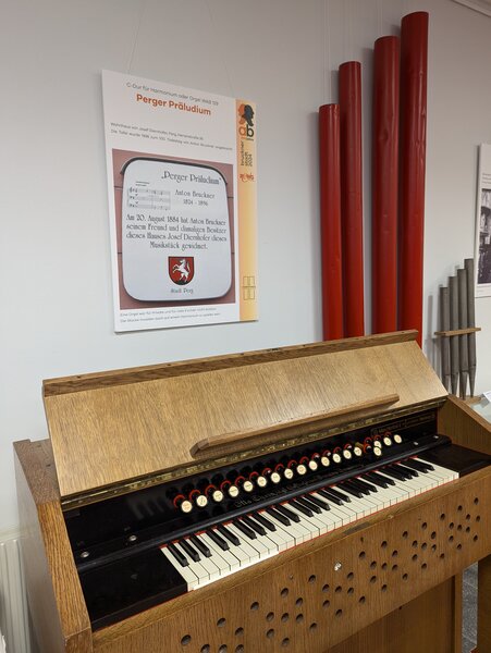 Blick in die Ausstellung: "Perger Präludium" - Harmonium, Original-Orgelpfeifen, Gedenktafel
