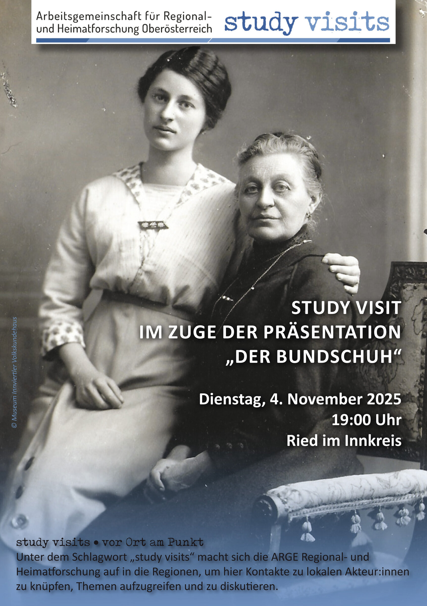 Für die Titelseite des "Study visits" der ARGE Regional- und Heimatforschung wurde ein Foto von Mutter und Tochter Scharrer aus dem Jahr 1915 gewählt. Ein Beitrag von Elisabeth Trauner im aktuellen "Bundschuh" widmet sich unter dem Motto „Verwitterte Steine, lebendige Geschichten“ der Arkadengruft der Familie Scharrer im Rieder Stadtfriedhof.