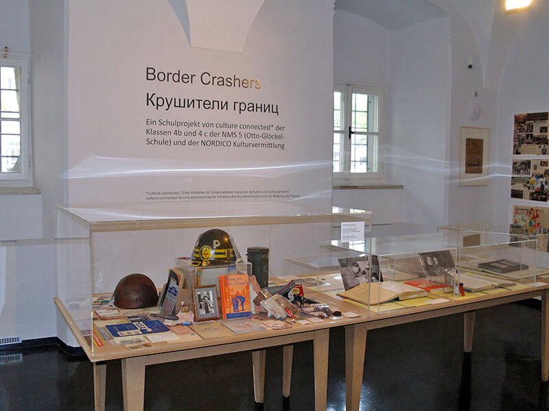 Ansicht zum Projekt „Border Crashers“, das von Schülerinnen und Schülern der Otto-Glöckel-Schule begleitend zur Ausstellung „GETEILTE STADT. Linz 1945-55“ durchgeführt und dessen Ergebnisse im Linzer Zimmer des NORDICO Stadtmuseum Linz ausgestellt wurden. 2015; © Verbund Oö. Museen
