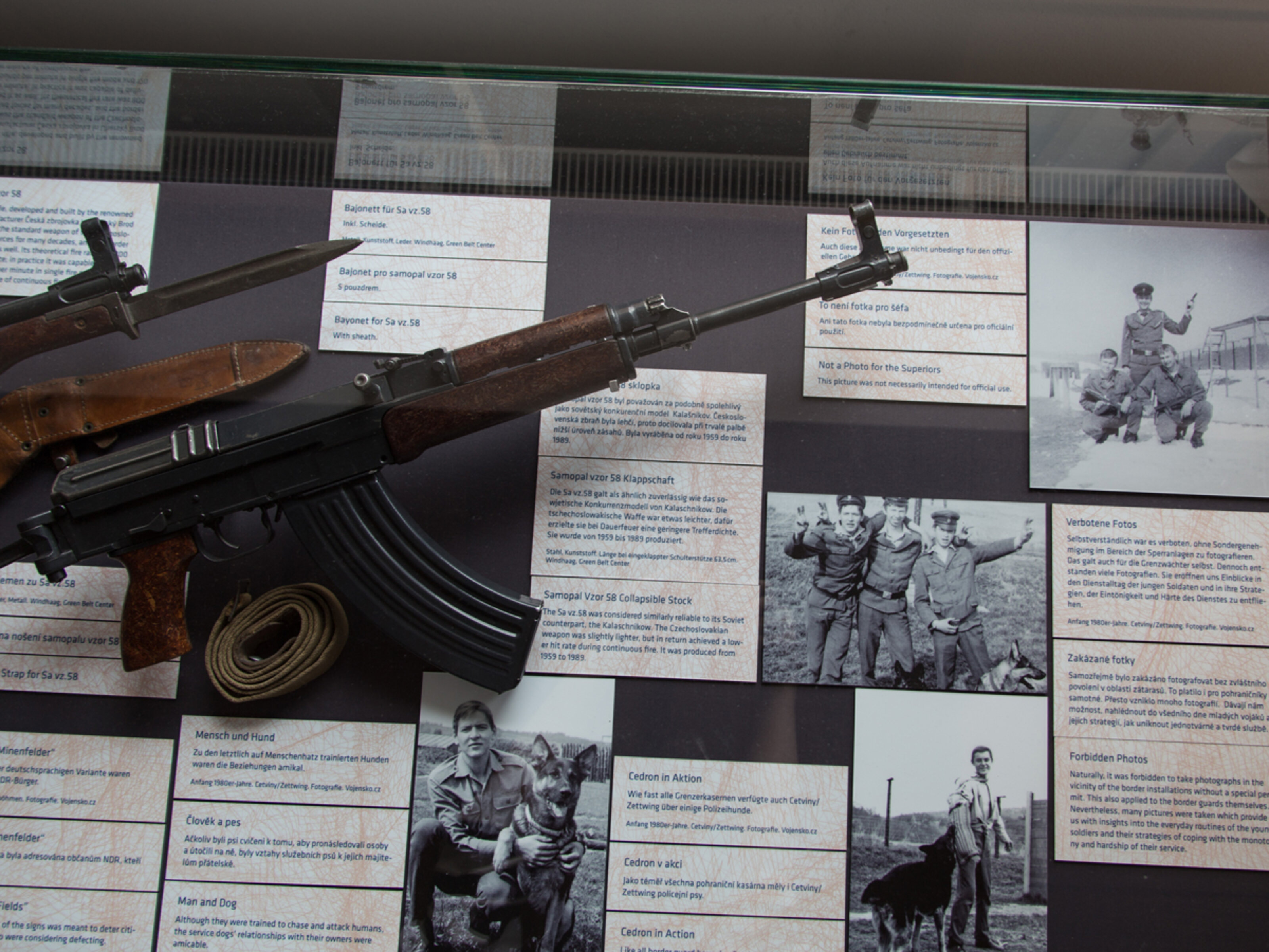 Samopal vzor 58: Dieses Sturmgewehr, entwickelt und gebaut in der renommierten Waffenschmiede Česká zbrojovka in Uherský Brod (Mähren), war jahrzehntelang die Standardwaffe der tschechoslowakischen Streitkräfte. Auch der Grenzschutz verwendete sie. Die theoretische Kadenz betrug 800 Schuss/min. In der Praxis lag die Leistung bei 40 Schuss/min (Einzelfeuer) und 120 Schuss/min (Dauerfeuer). Stahl, Kunststoff. Kaliber 7,62 mm. Länge 84,5 cm. Gewicht ungeladen 3,1 kg. Windhaag, Green Belt Center