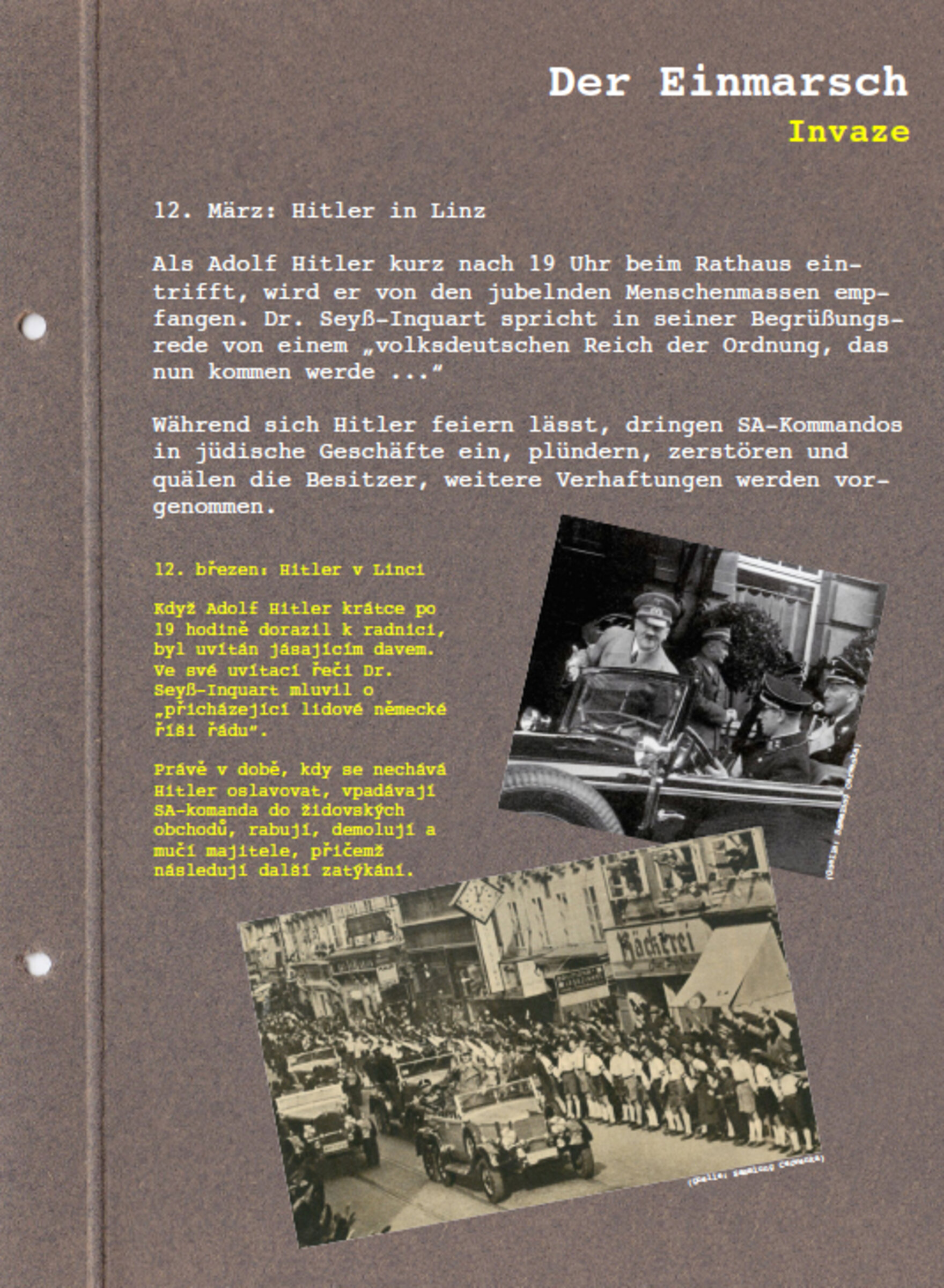 Ausstellungstafel: Der Einmarsch | Ausstellung im Mühlviertler Schlossmuseum "Das Jahr 1938 - Ausgrenzen: Verschobene Grenzen", 9. Juni bis 15. Juli 2018. (c) Mühlviertler Schlossmuseum