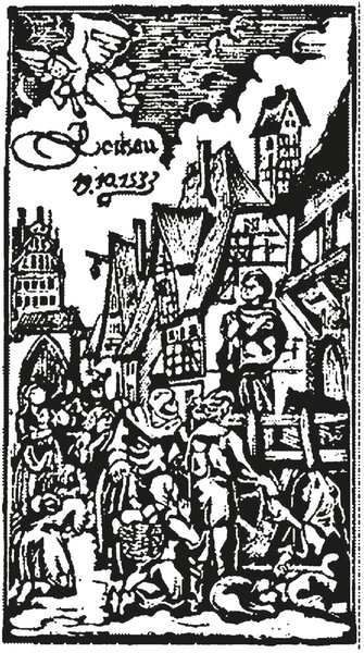 Michael Stifel berechnete den Weltuntergang für den 19. 10. 1533. Holzschnitt (Reproduktion)