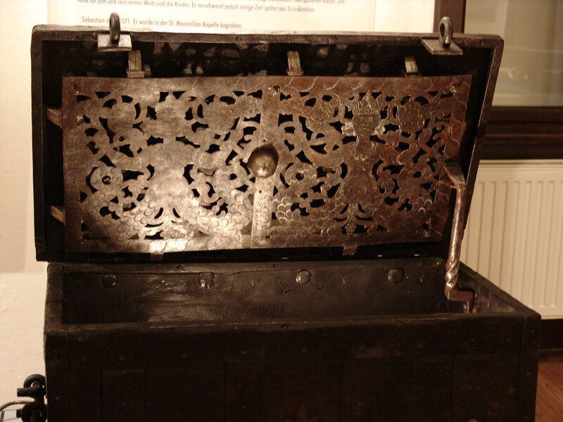 Ausstellungsansicht "Blütezeit der Reformation" mit einer schmiedeeisernen Truhe - Die Jörger von Tollet, Begleitausstellung zur OÖ. Landesausstellung 2010, Foto: Fam. Keller, Geboltskirchen