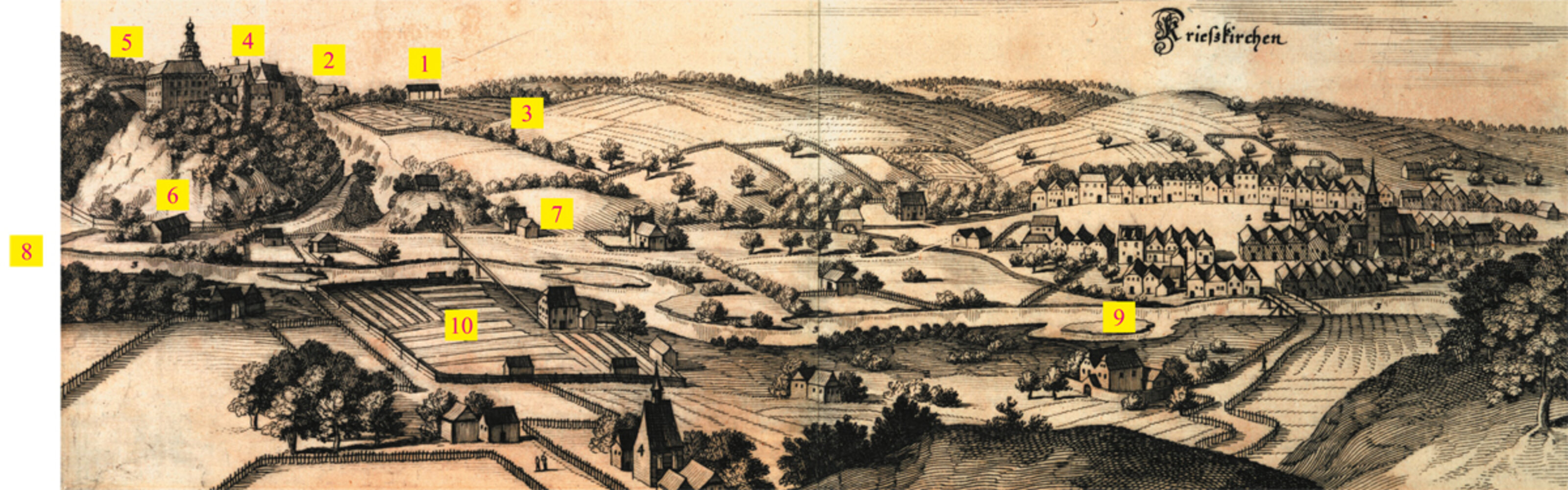 Ansicht der Herrschaft Tollet und seiner Umgebung auf dem Ausschnitt eines Merian-Stiches von ca. 1650.