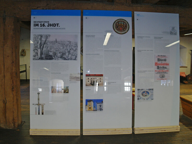 Die Stadt Steyr im 16. Jahrhundert, Sonderausstellung „1517! Und Heute?“ im Museum der Stadt Steyr, Ausstellungstafeln, 2017. Foto: Verbund Oö. Museen