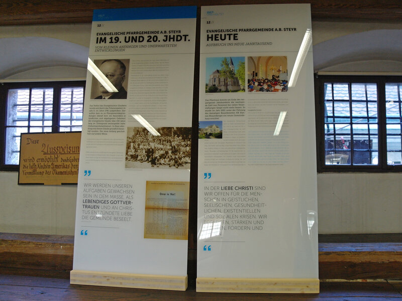 Der neue Anfang. Die Evangelische Pfarrgemeinde Steyr im 19. und 20. Jahrhundert. – Ausstellungsansicht "1517! Und Heute?"; Gestaltung: Matern Creativbüro; Foto: Verbund Oö. Museen, 2017.