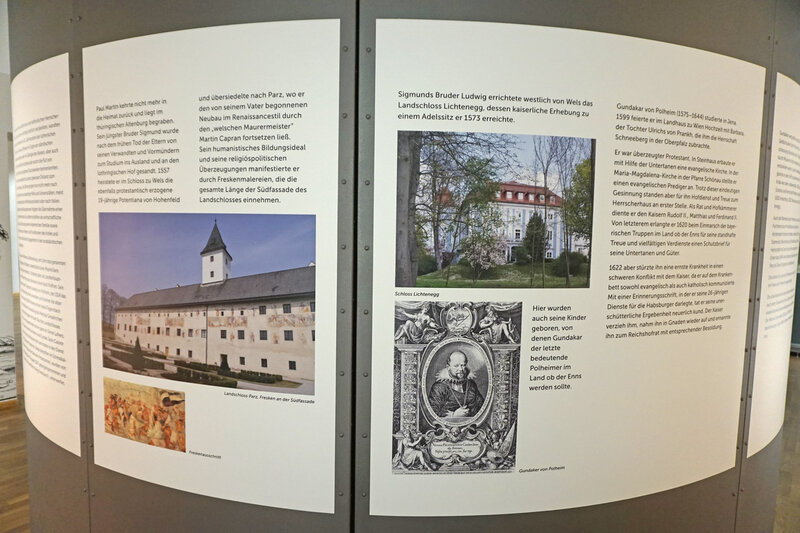 Blick in die Ausstellung: Installation "Turm": "Die Herren von Polheim"; Sonderausstellung im Stadtmuseum Wels-Burg "Maximilian I. Kaiser - Reformer - Mensch", 2019.