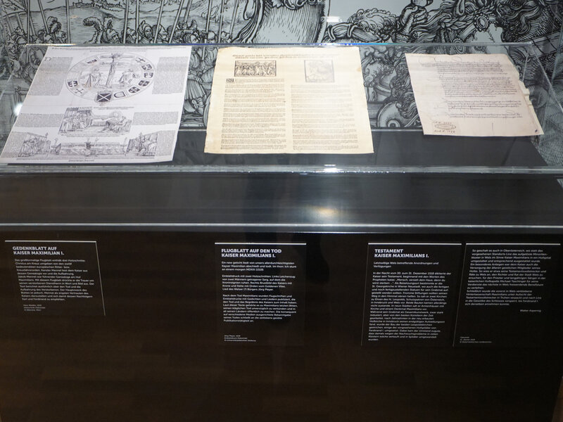 Gedenkblatt auf Kaiser Maximilian I., Hans Weiditz, 1519, Holzschnitt (Faksimile), Original: Albertina, Wien; Flugblatt auf den Tod Kaiser Maximilians I., Jörg Pleyer, 1519, Einblattdruck (Faksimile), Original: Universitätsbibliothek Salzburg; Testament Kaiser Maximilians I., Urkunde, 11. Jänner 1519, Original: Steiermärkisches Landesarchiv; Foto: Verbund OÖ. Museen, 2019