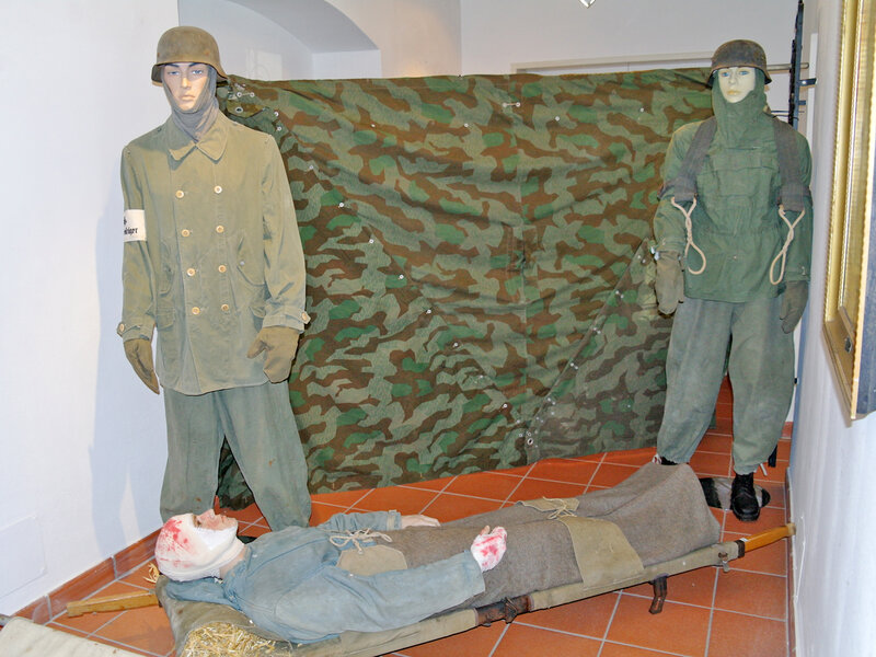 Szene Zwei wurde im Untergeschoss des Museums installiert. Hier ist der Abtransport des Verwundeten durch Hilfskrankenträger zu sehen, im Hintergrund befindet sich eine Zeltplane sowie an der Wand ein Propagandabild aus der Zeit um 1940, dessen herorische Darstellung in starkem Gegensatz zum verwundeten Soldaten steht.