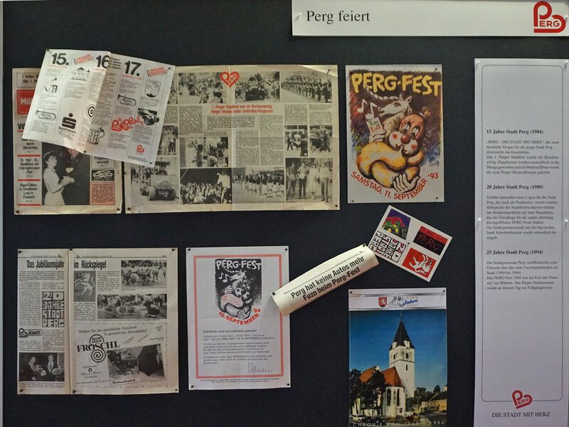 Jedes Jubiläum wurde ausgiebig gefeiert. 15 Jahre Stadt mit dem 1. Perger Stadtfest, 20 Jahre Stadt mit einem Straßenfest und 25 Jahre Stadt mit einem PERG-Fest. Ausstellungstafel im Heimathaus-Stadtmuseum Perg.