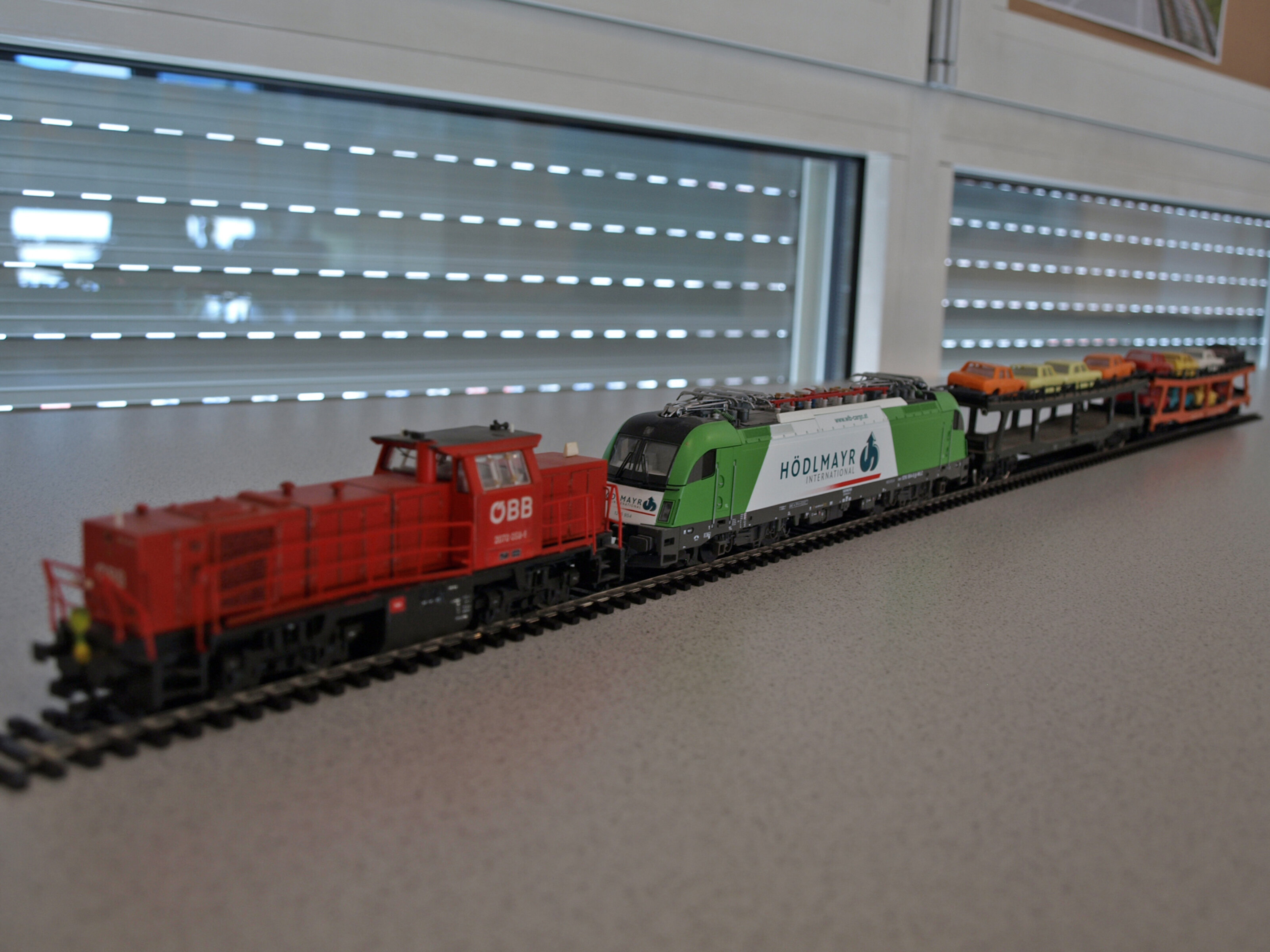 Modell: Dieselverschublok Baureihe 2070 mit Autotransportzug zur Firma Hödlmayr, Schwertberg.