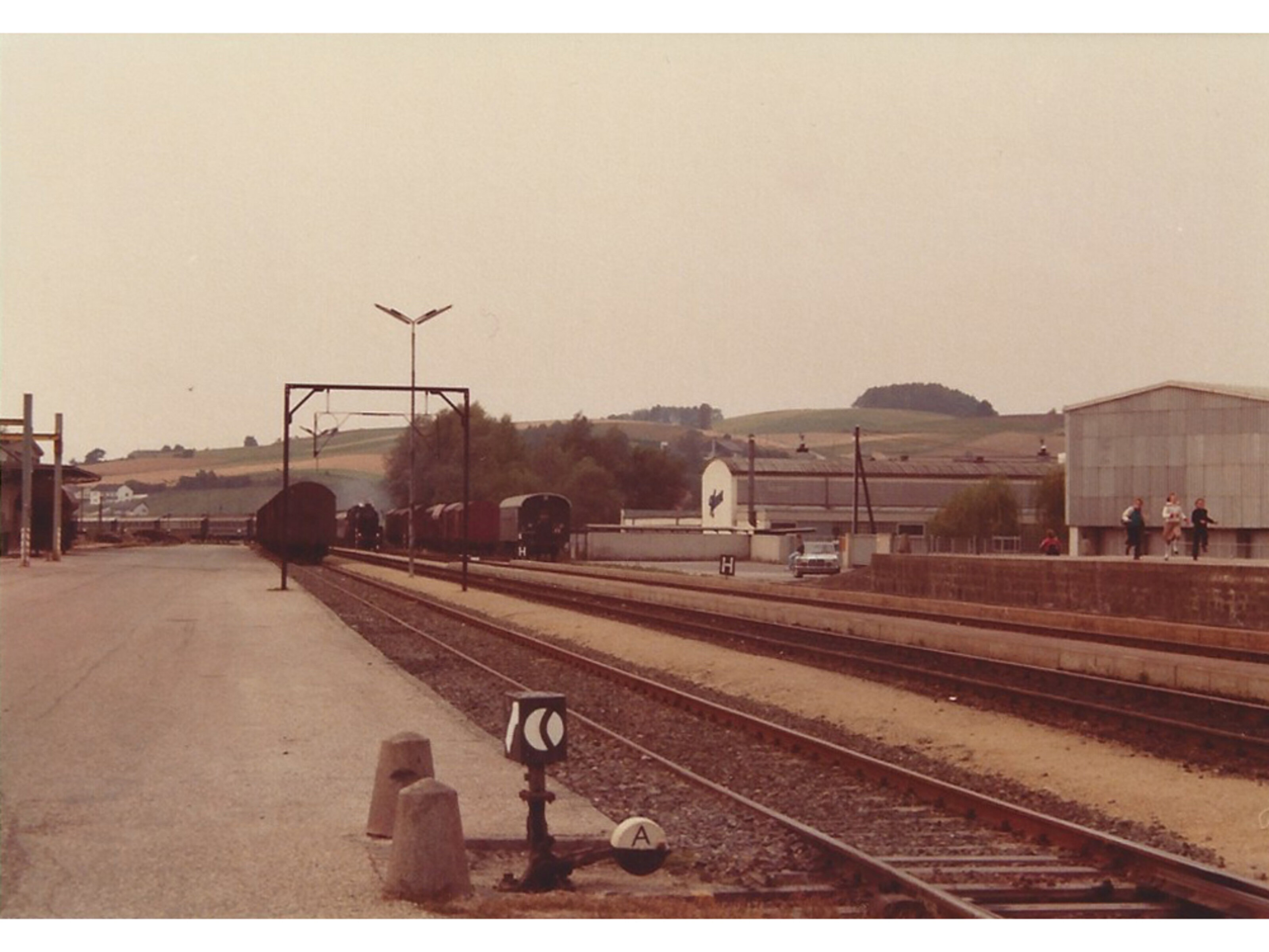 Bahnhof Perg mit Manner-Werk im Hintergrund, Aufnahme 1983.