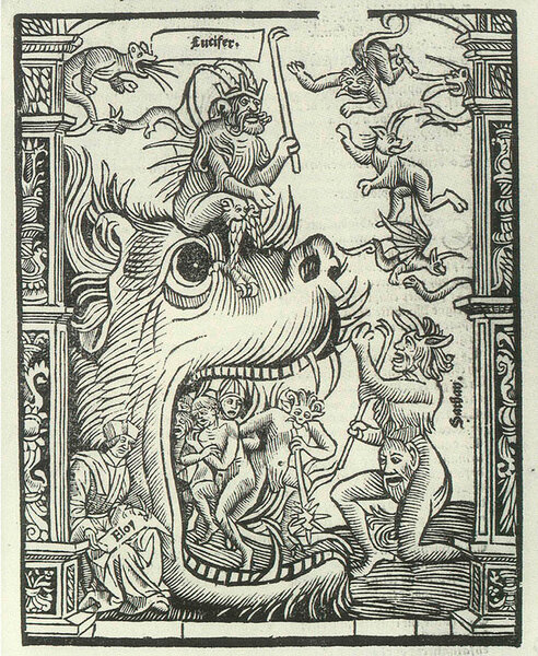Darstellung des Lucifer. Aus: Eloy d’Amerval: Livre de la Deablerie, Paris, 1508. Es beschreibt den Dialog zwischen Satan und Luzifer.
