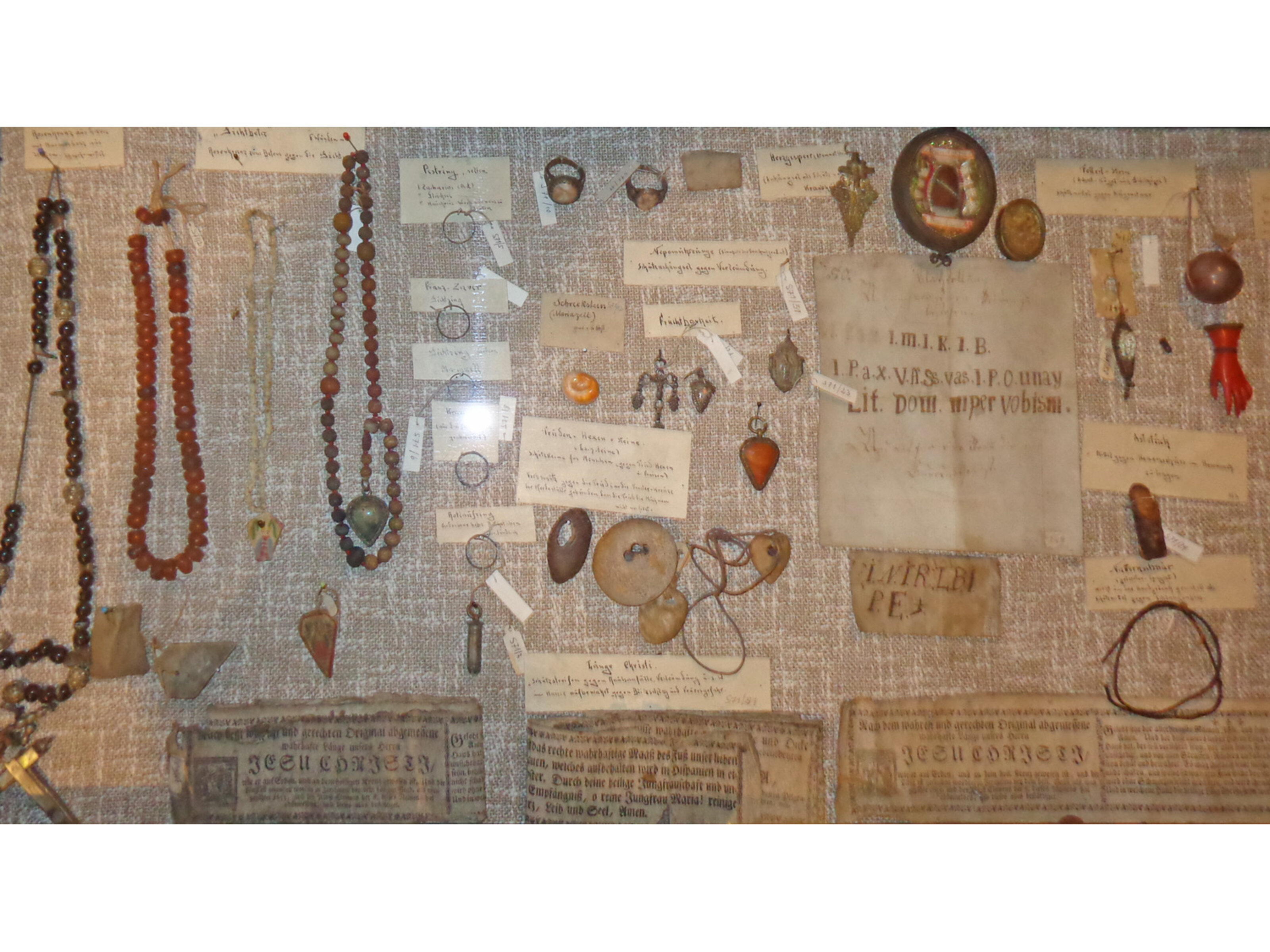 Magie und Zauberei im Alltagsleben: Vitrine im Schlossmuseum Linz mit zahlreichen Objekten zur Abwehr von Gefahr und Krankheit: Truden-Hexen-Steine, Nepomukzunge, Pestring, Länge Christi, etc.