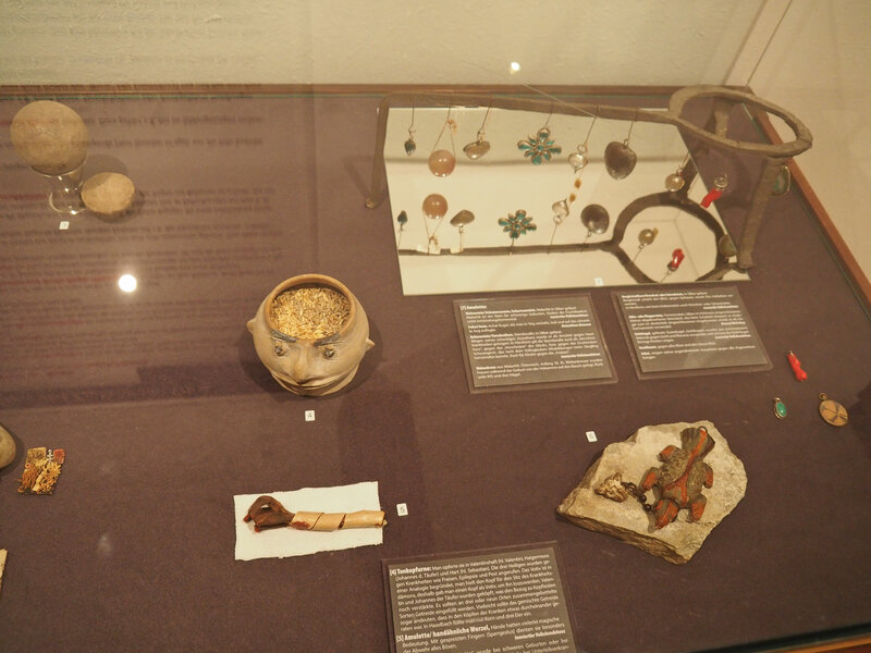 Blick in eine Vitrine: Verschiedene Utensilien zur Abwehr von Krankheiten: Amulette, Tonkopfurne, Gebährkröte, Bezoarstein,...