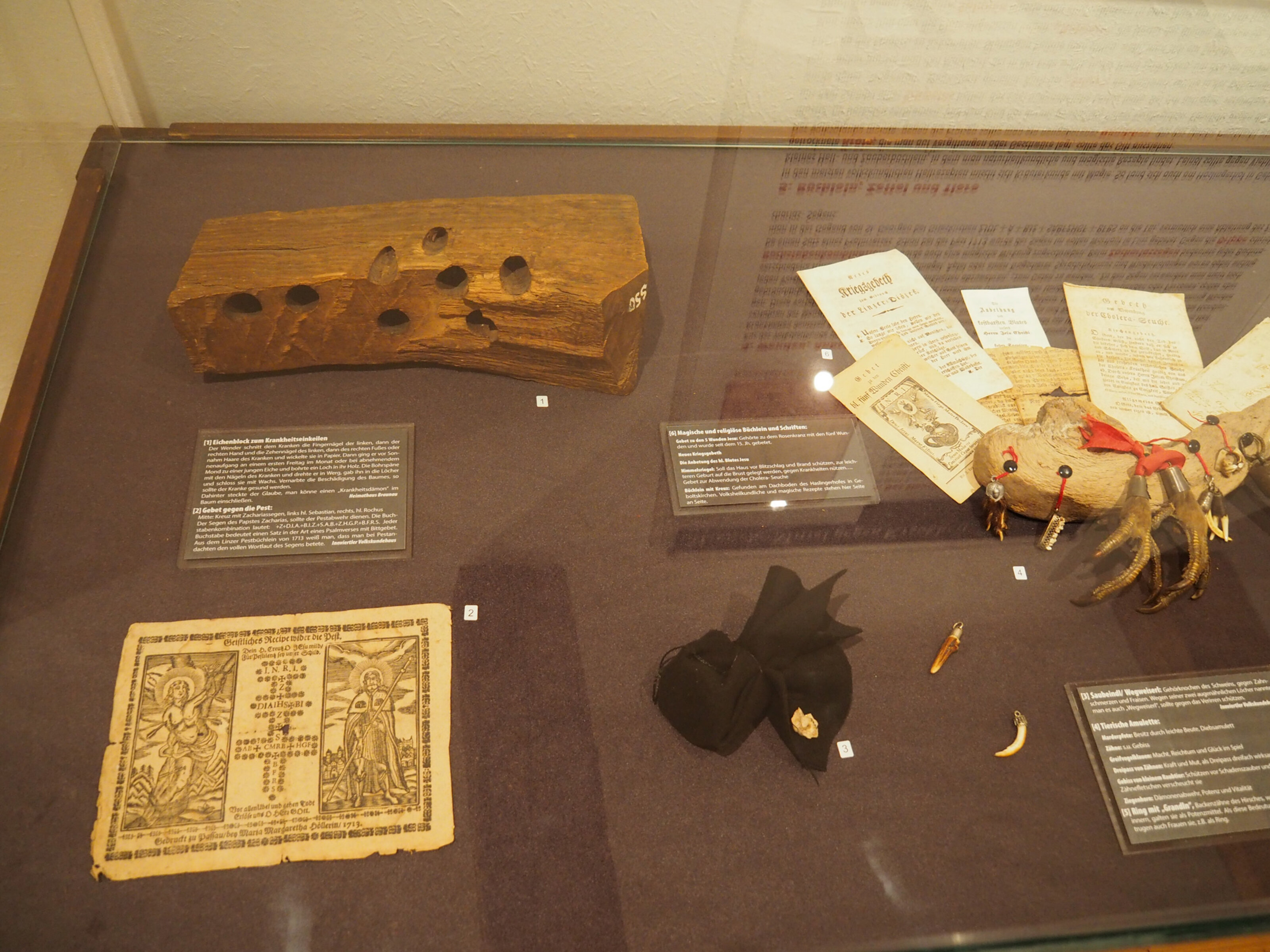 Blick in eine Vitrine: Eichenblock zum Krankheitseinkeilen, „Wegweiserl“, Gebet gegen die Pest;