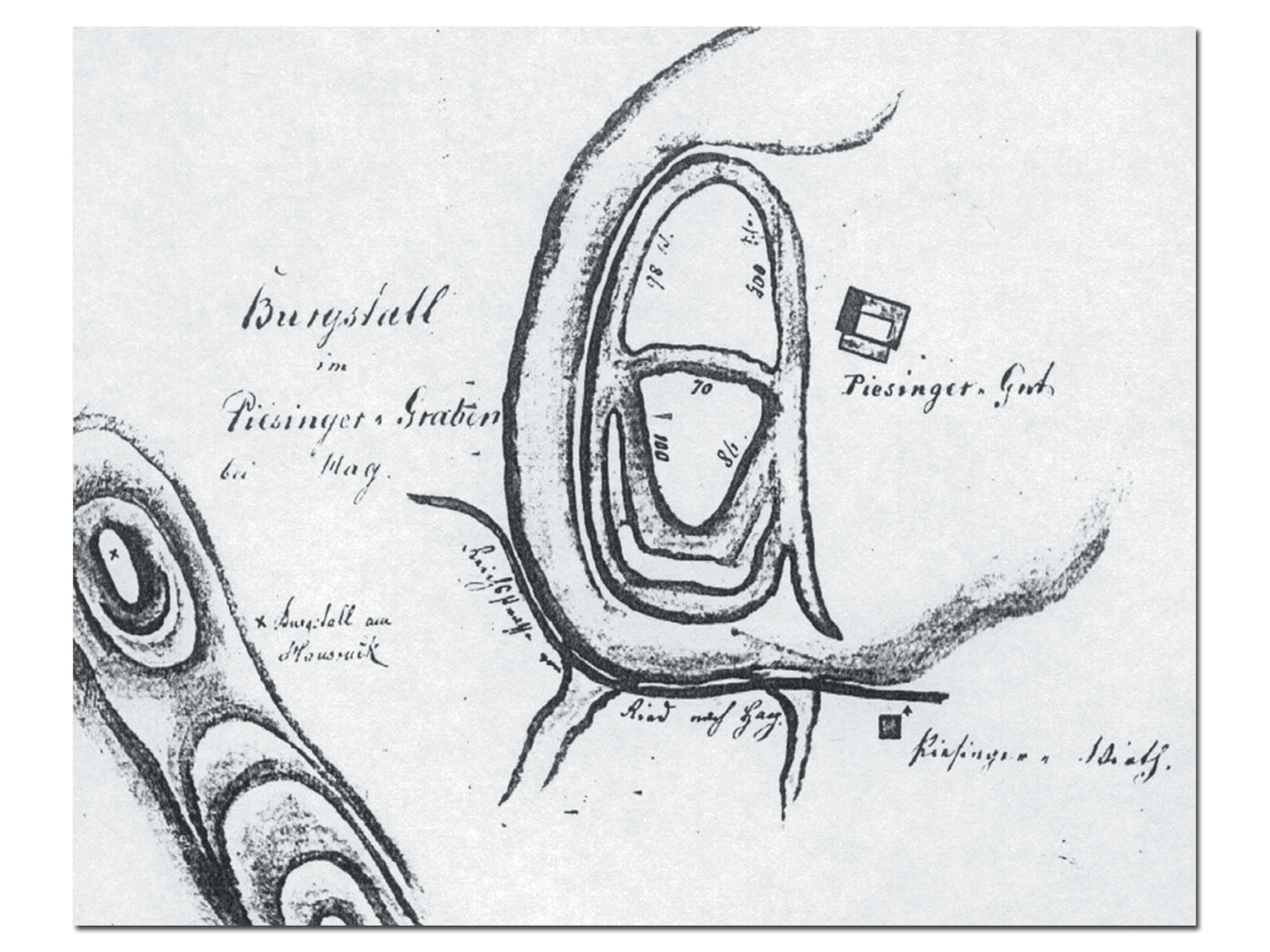 Skizze des "Burgstalls im Piesinger Graben" von Johann Evangelist Lamprecht