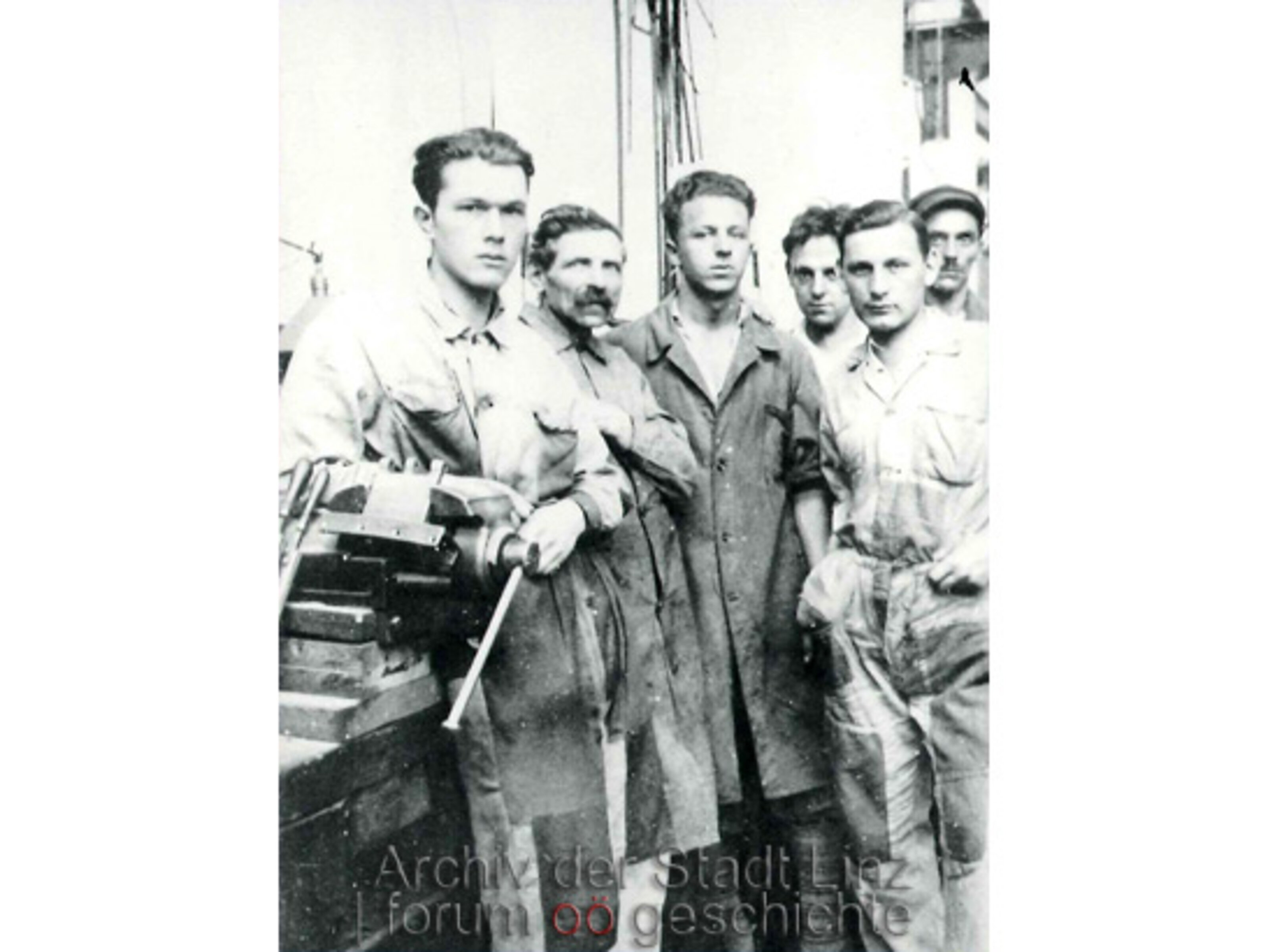Landesparteiobmann der Kommunistischen Partei Josef Teufl (1904-1945), im Bild links. Er wurde im Konzentrationslager Mauthausen ermordet. Bild aus dem Nachlass Peter Kammerstätter im Archiv der Stadt Linz, publiziert in: