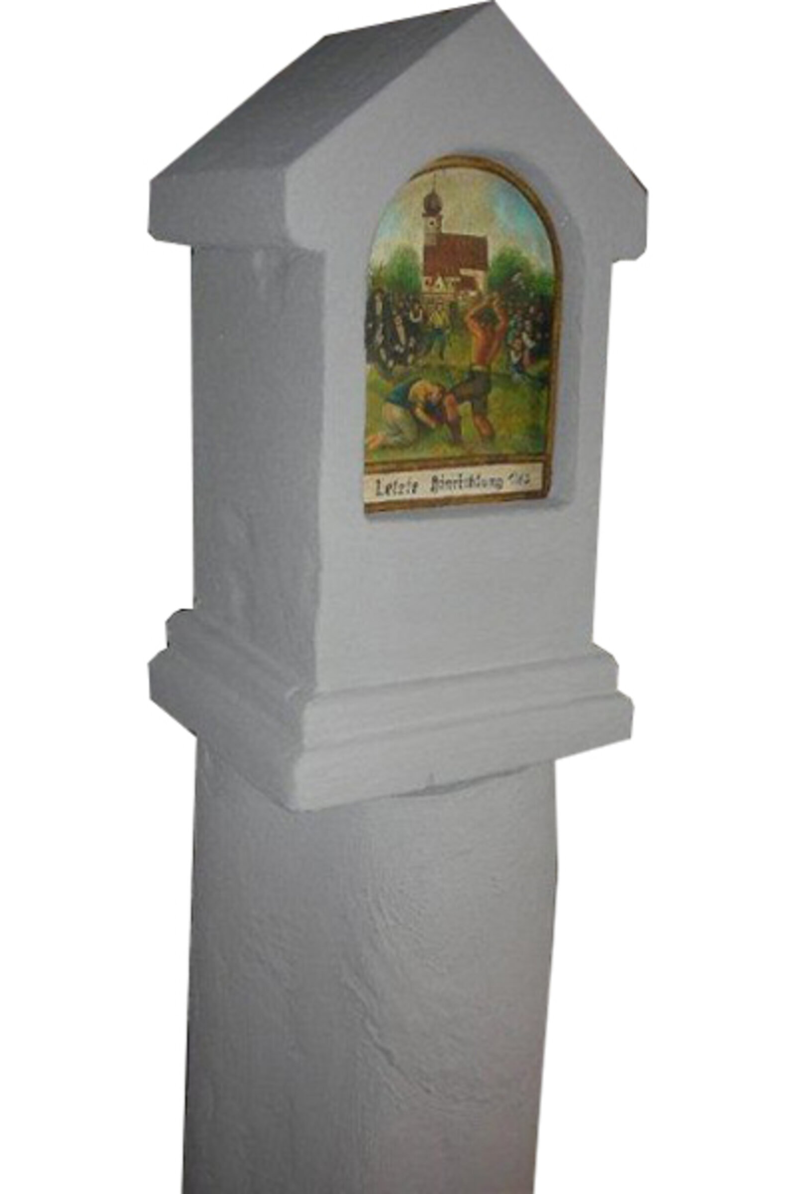 Kopfstättsäule in Astätt, Modell, Peter Nehring, 2011; Leihgabe Peter Nehring, Lochen. Vor dem ehemaligen Krämerhaus in Astätt bei Lochen/Innviertel befindet sich die originale steinerne Kopfstättsäule mit einem Aufsatz, in dessen Nische ein Blechbildchen Platz findet. Ein Bild mit der Darstellung der Enthauptung des hl. Johannes erinnert an die letzte Hinrichtung am 8. Februar 1762 (Magdalena Bischelsroider). Das zweite Bildchen zeigt eine Richt-Szene mit den Worten "Letzte Hinrichtung 1762". Die originale Säule ragt 128 cm aus dem Boden. Bildtext: Herbert Handlechner
