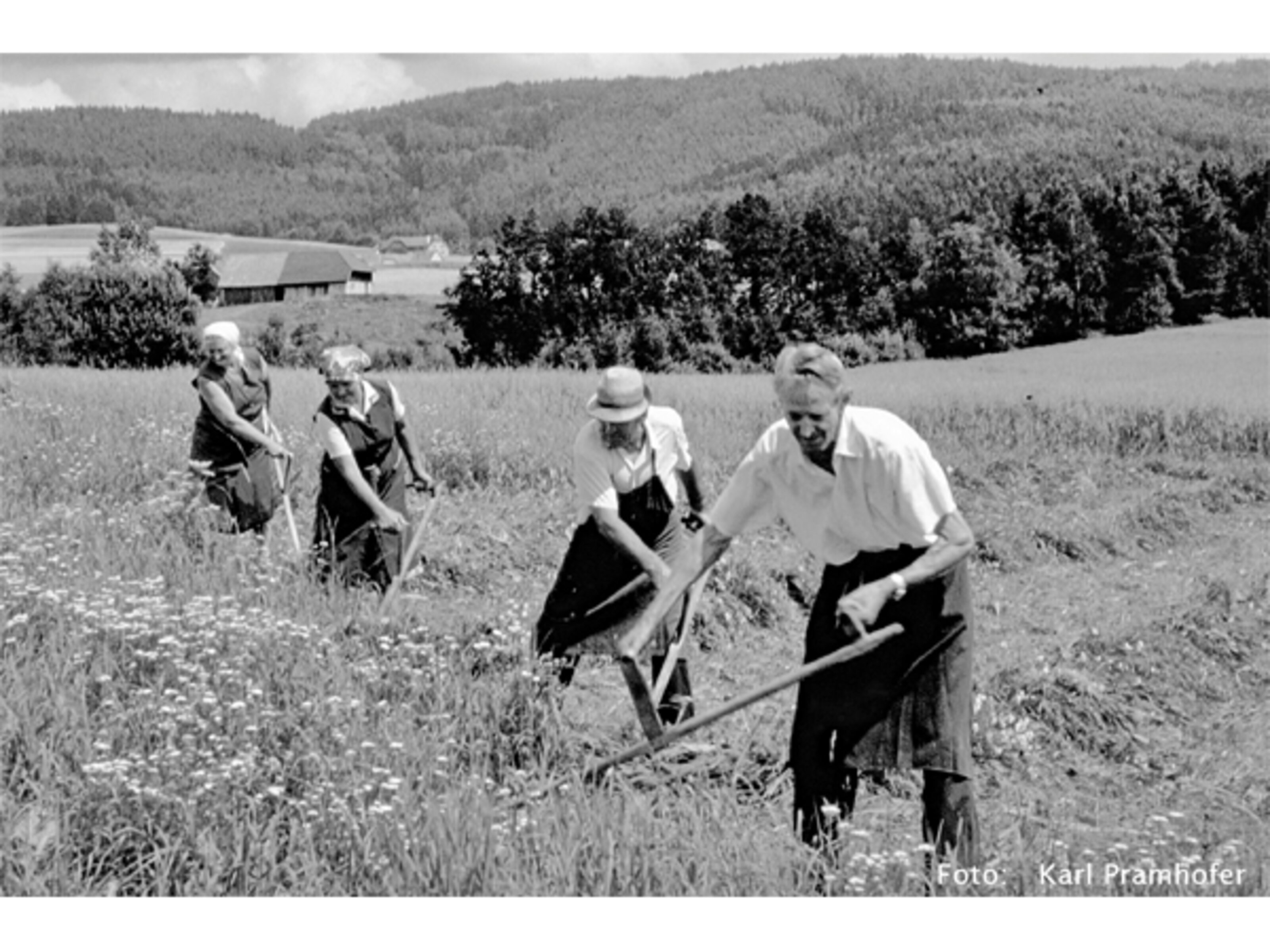 Handmähen in Freistadt. 4 Personen konnten in der Stunde bis ca. 2500 m² mähen.