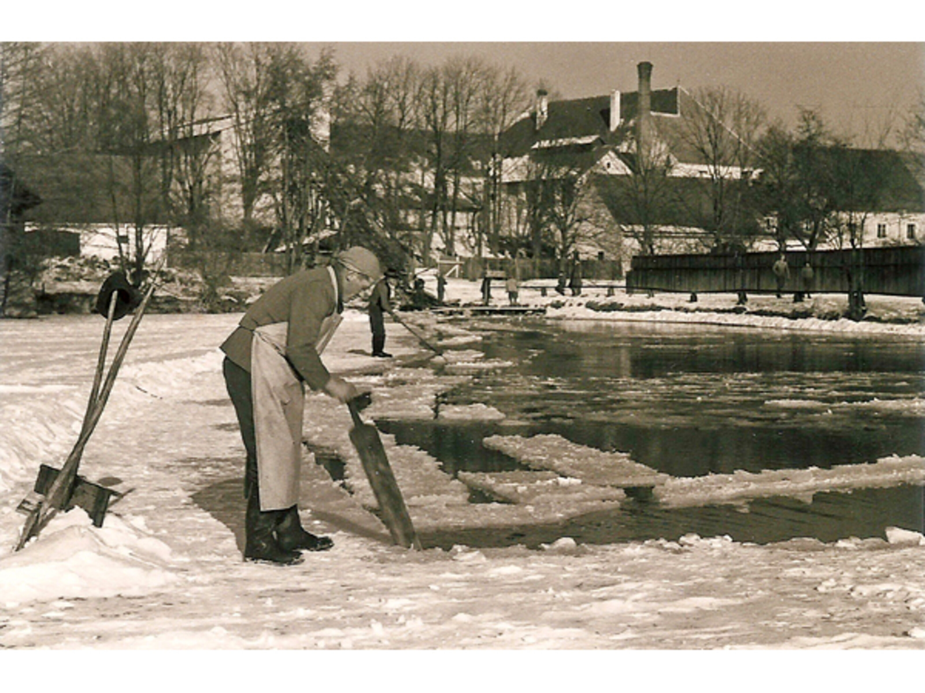 Eisschneiden am Brauereiteich in Freistadt, um 1950.