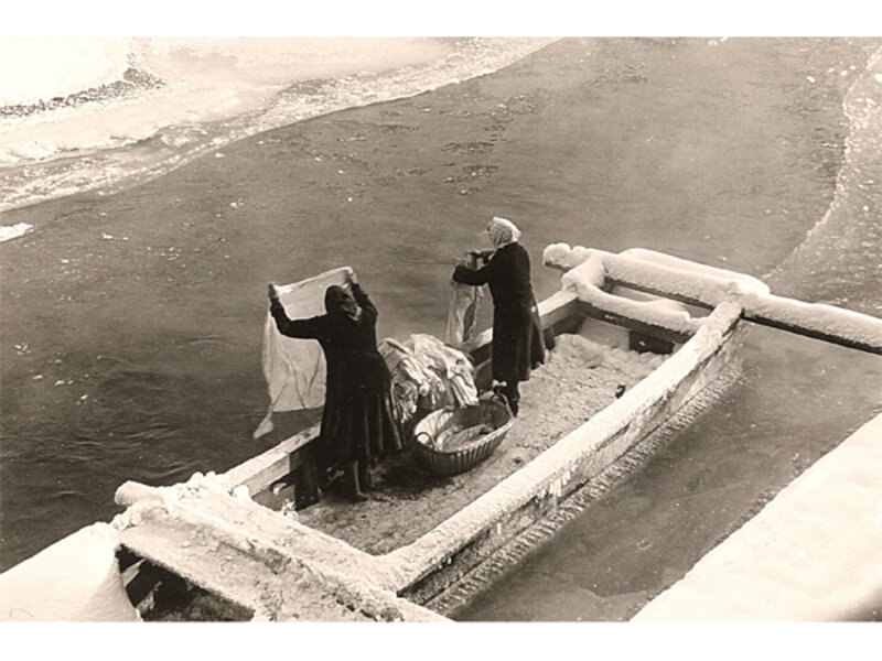 Wäsche schwemmen im Winter am Fluß, um 1940.