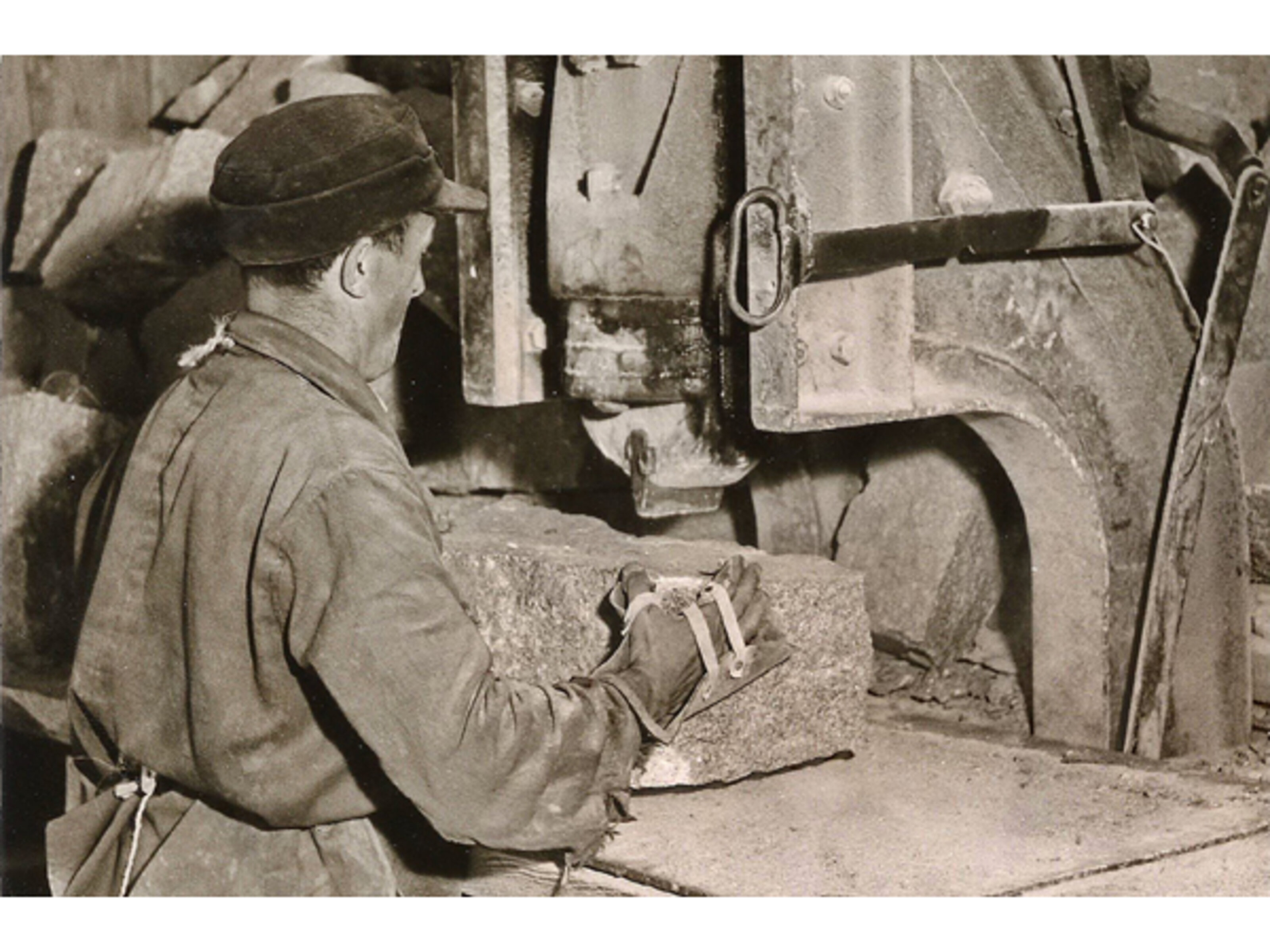 Steine spalten mit dem Fallhammer, Tagesleistung im Akkord 5-6 Kubikmeter p. Person, um 1960.