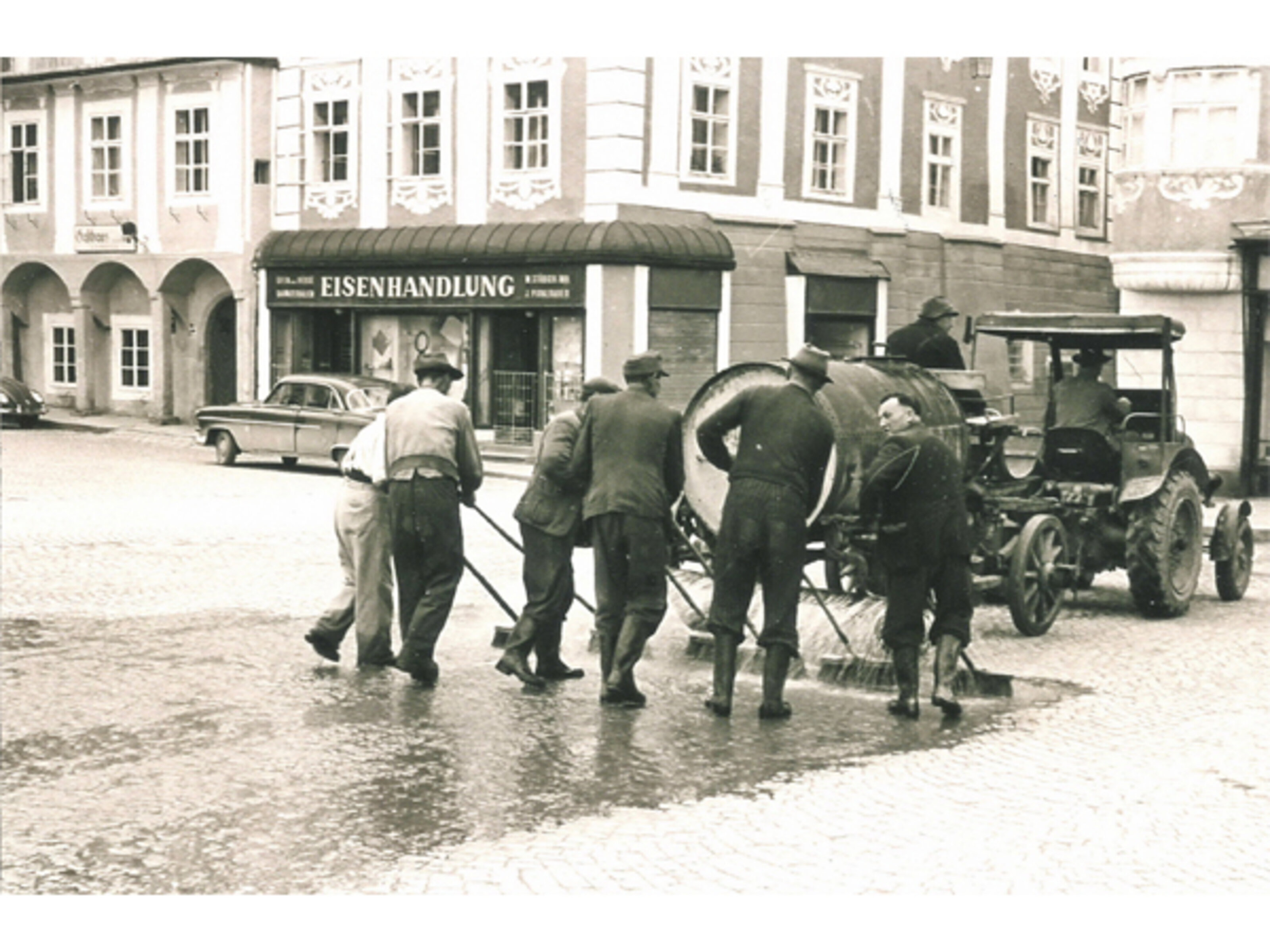 Einschlämmen nach dem Pflastern am Stadtplatz in Freistadt, um ca. 1960.