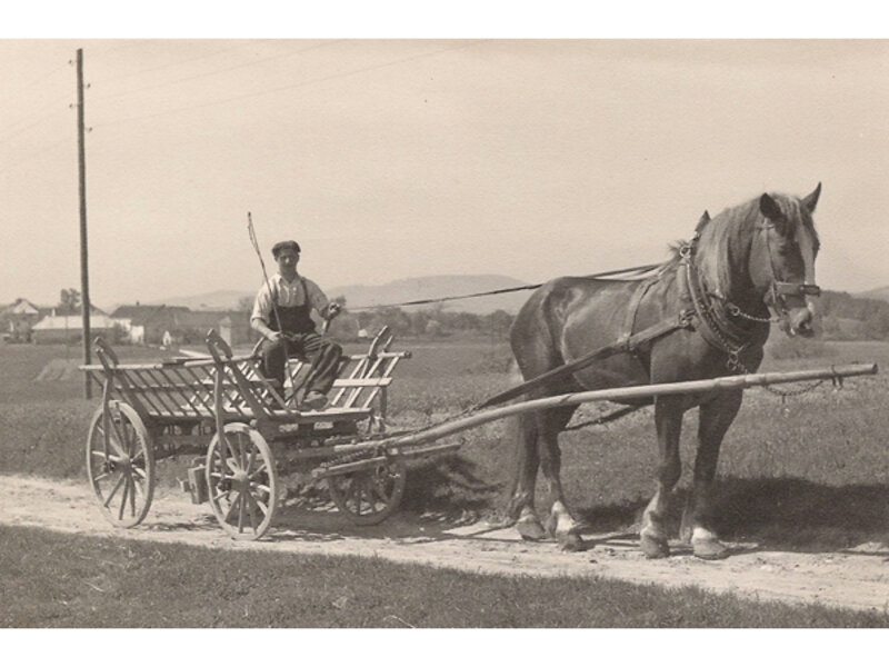 Pferdefuhrwerk vom Stallingergut in Spattendorf / Gemeinde Alberndorf, um 1948.