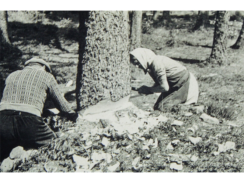 Baumfällen mit der Zugsäge in Harrachstal / Gem. Weitersfelden, um 1950.