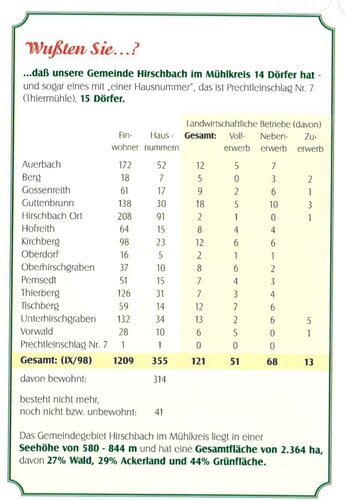 Die Veranstaltung blickt zurück auf jedes Hirschbacher Dorf im Jahr 1998/99 und betrachtet die Veränderungen der Einwohner, die Anzahl der Häuser und die landwirtschaftlichen Betriebe (Voll und Nebenerwerb).